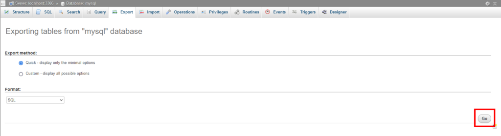 Après deux méthodes, soit tout se passe bien et tu peux directement l’importer depuis le bouton Import de ton phpMyAdmin local, soit comme un problème auquel j’ai été confronté, ça ne fonctionne pas et faut faire ça autrement.