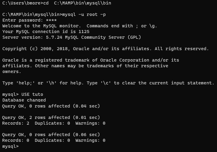 mysql -u username -p(Remplace « username » par le nom d’utilisateur de ta base de données MySQL normalement, c’est root. Cette commande te demanderas ensuite votre mot de passe et normalement, c’est root aussi.). - Ensuite avec