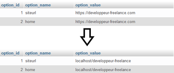 Le premier correspond donc au nom de domaine en ligne, tandis qu’après modifications il correspond au localhost/le_nom_du_dossier_du_site qui se trouve dans ton htdocs. Ici dans mon htdocs j’ai donc htdocs/developpeur-freelance.